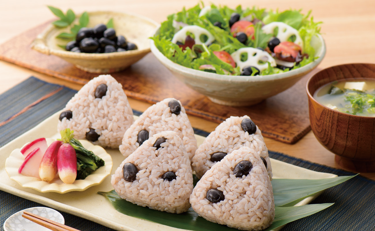 大粒の黒豆とほんのり塩味の黒豆煮汁が入った、炊きこみごはんの素。お米とお水を加えて炊飯器で炊くだけで、ほっこり艶のよい黒豆ごはんができあがります。