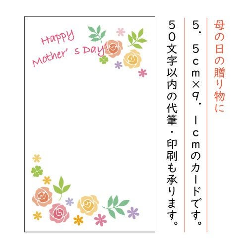 他の画像を見る メッセージカード【母の日・父の日用】 販売価格 ¥ 0 税込 丹波の黒太郎の母の日/父の日専用メッセージカードです。 ご希望のカードをお選びください。 50文字以内の代筆・印刷も承ります。 詳細を見る
