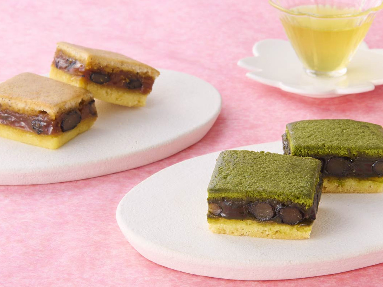 抹茶が香る生地と抹茶キャラメルを重ね、ふっくらと大粒の黒まめを合わせました。