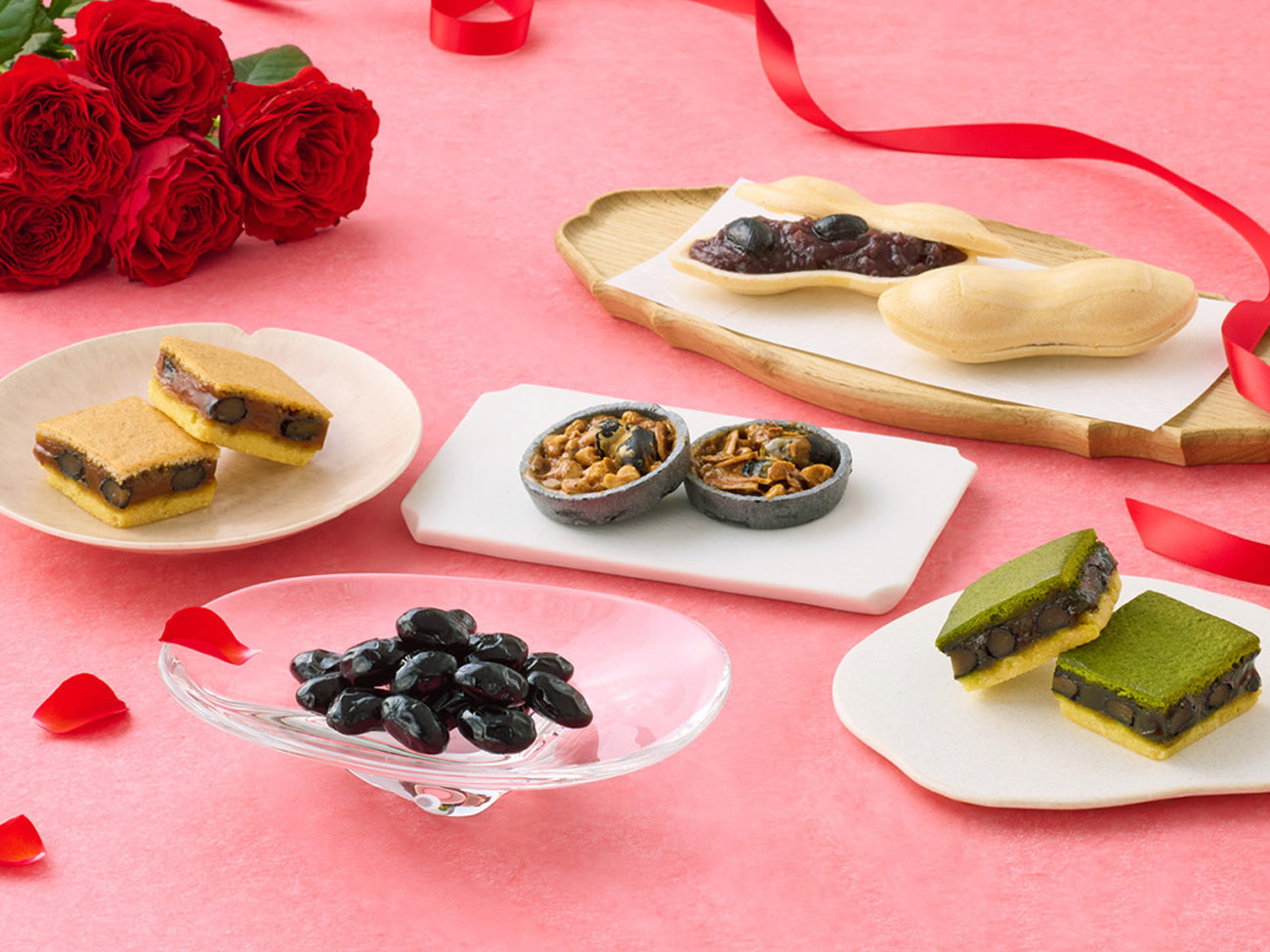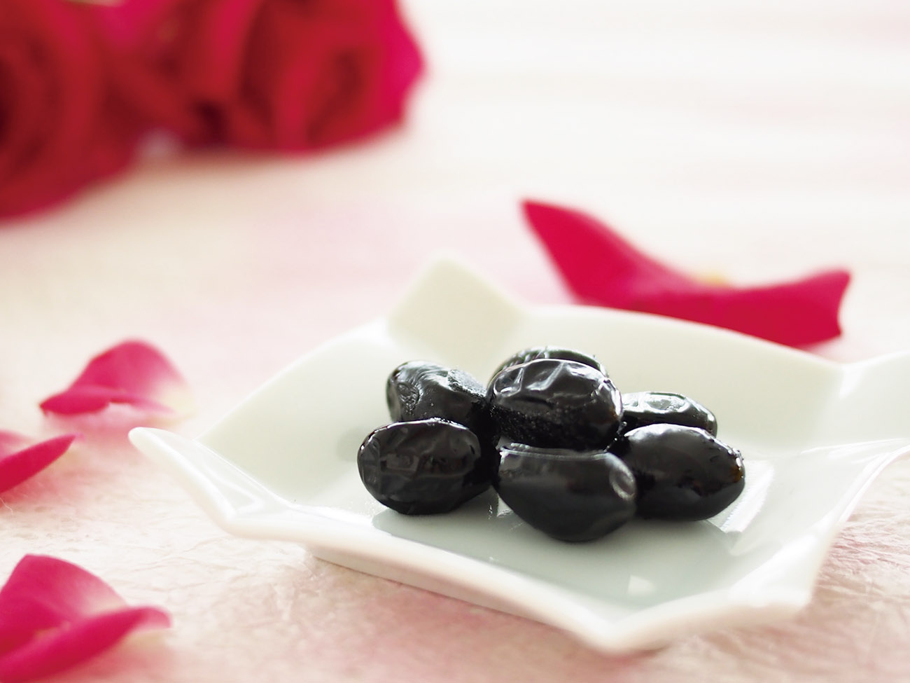 たっぷりと蜜を含んだ「黒まめ ふくみ」に、バラの花びらから作られたリキュールを浸みこませ、優雅な香りの黒まめ菓子に仕上げました。