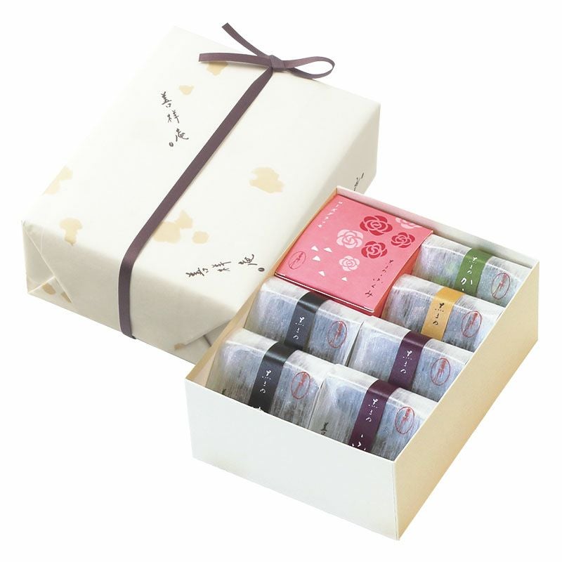 バラの花から作られたローズ酒で香り付けした「黒まめ ふくみ<ローズグラッセ>」と、人気のまめ菓子4種をお詰合せ。優雅で華やかな香りを楽しめます。