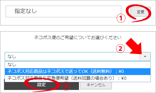 この項目の「変更」ボタンより、ネコポス可・不可の選択肢からいずれかをお選びください。