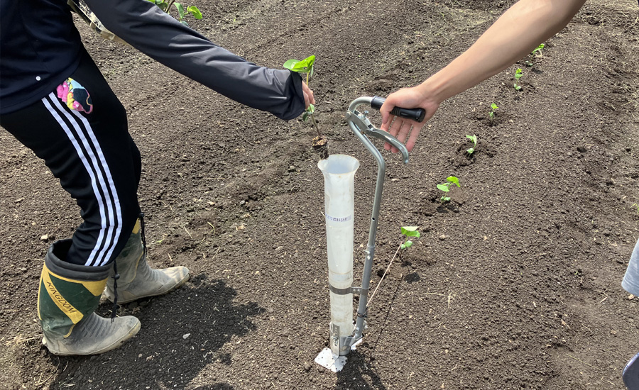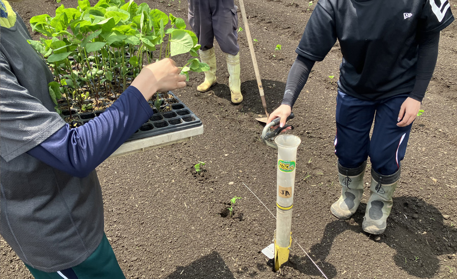 新入社員を含めたスタッフが参加し、苗をポットから畑に植え替える作業を行いました。