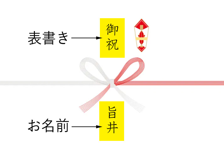 「水引」をはさんで、上下に「表書き」と「お名前」を入れることができます。