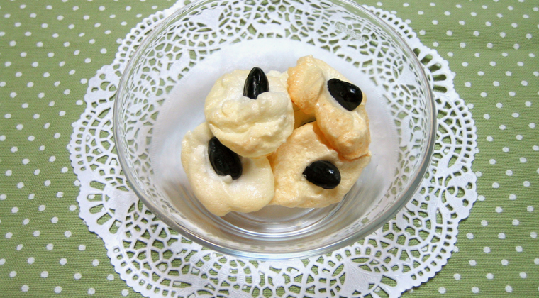 オーブンにアルミホイルをしき、サラダ油を薄く伸ばして(1)の泡だった欄卵白を500円玉大におき20個くらい同じ大きさで作る。