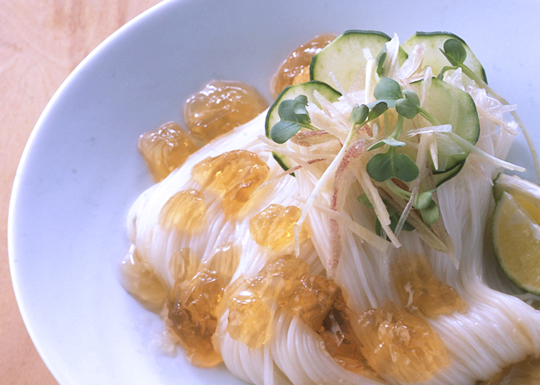 ジュレのクラッシュが涼やかで変わった素麺料理に。
