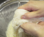 ゆであがりましたらザルにとり、流水で冷やしてから、ある程度冷めたら氷水でさっともみ洗いします。