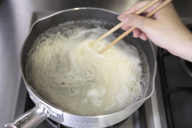 大きめの鍋に水を入れて沸騰させ、沸騰したら束を解いて、麺がかたまらないようにバラバラと入れる。